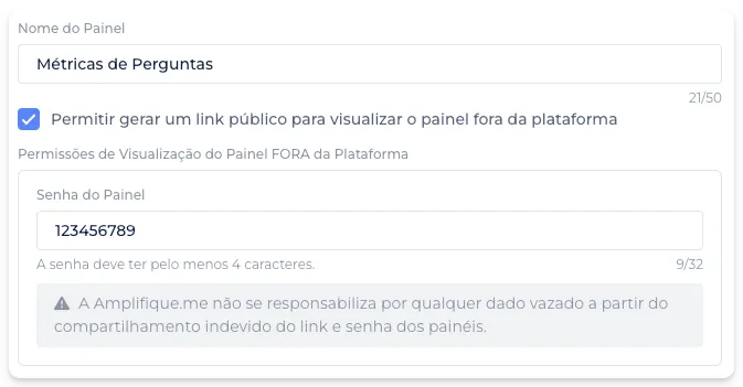 Agora, é possível gerar um link público para visualizar um determinado painel do Painel Principal sem a necessidade de possuir uma conta na plataforma, necessitando apenas da senha do painel definida previamente por quem o criou.