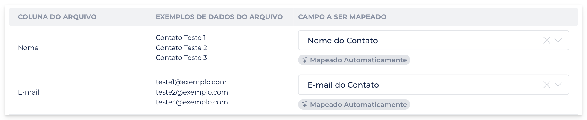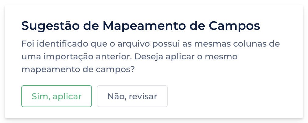 - Agora, ao importar um arquivo que possui as mesmas colunas de um arquivo importado anteriormente, a plataforma poderá sugerir automaticamente o mesmo mapeamento de campos utilizado antes.