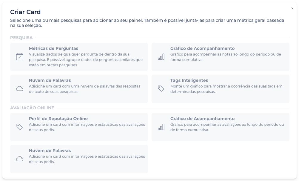 Esse identificador era usado principalmente para somar perguntas de diferentes pesquisas nos cards do painel. Agora, ele é gerado automaticamente pela plataforma, mantendo essa funcionalidade sem exigir configuração manual.