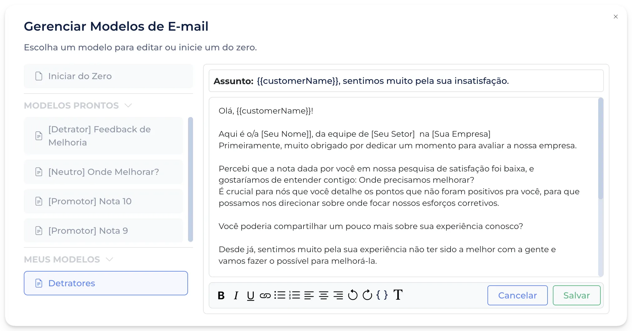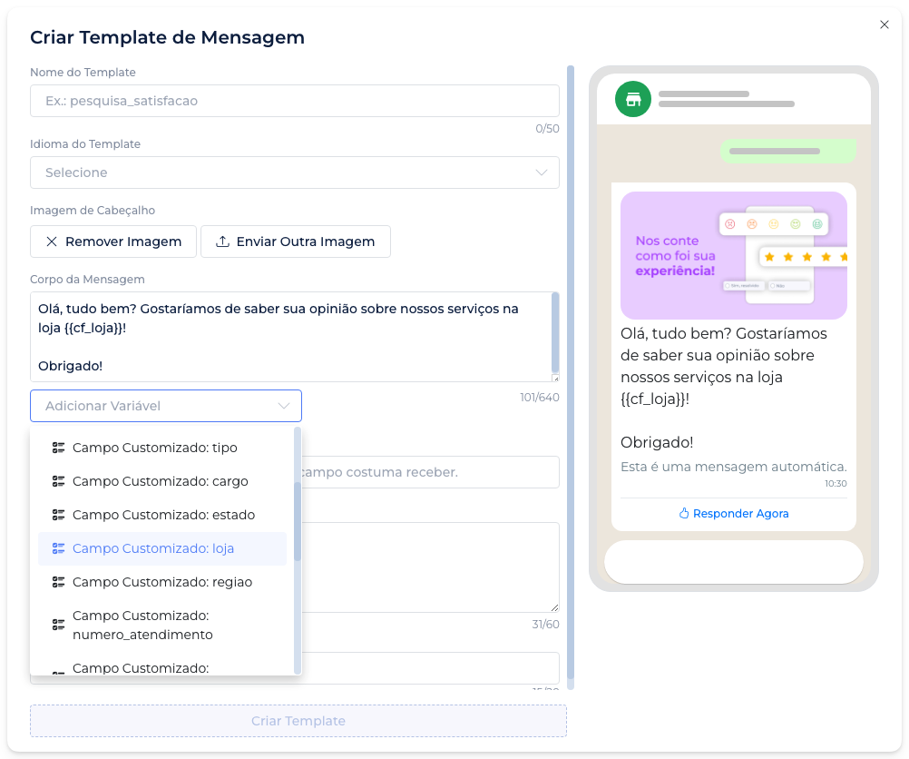 Ao criar um modelo pela plataforma, agora é possível adicionar campos customizados ao texto, aumentando a personalização da sua comunicação com o cliente.