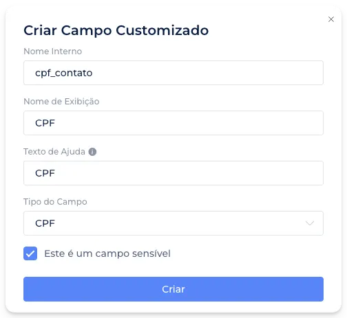 Além disso, é possível definir se um Campo Customizado é um dado sensível através da opção "Este é um campo sensível”. Quando ativada, usuários com a opção "Esconder Dados Sensíveis” não verão ou poderão editar este campo.