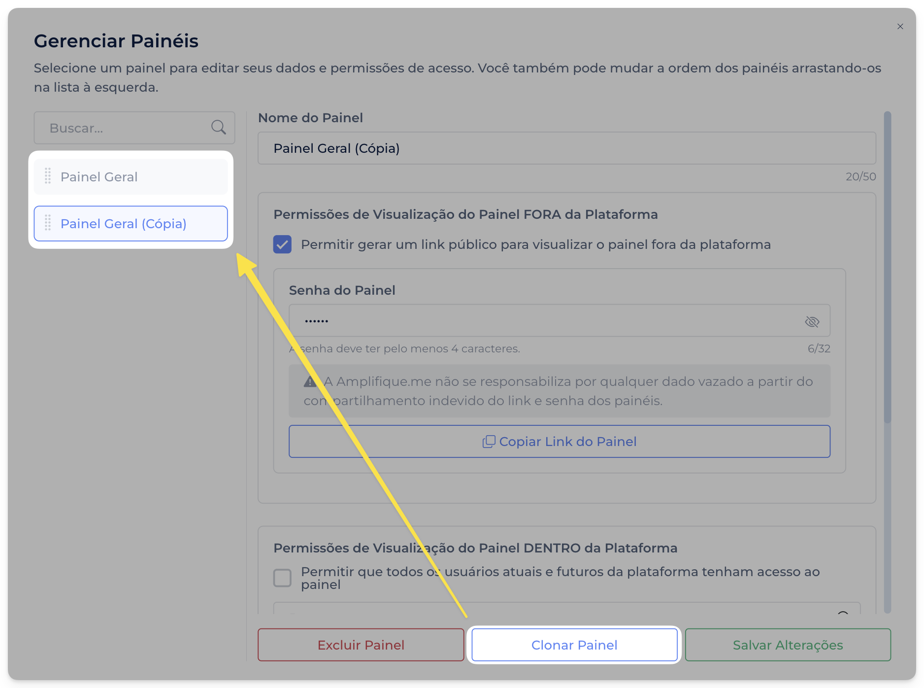 De volta ao Painel Principal, clique no botão "Copiar Link do Painel" para ter acesso ao link público.
