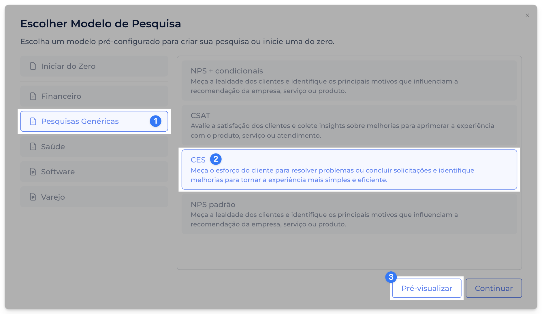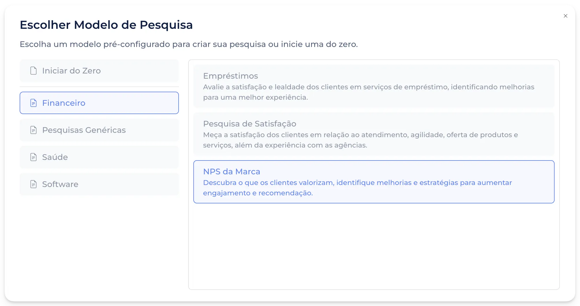 Agora, ao clicar no botão de Criar Pesquisa na tela de Pesquisas, você poderá selecionar um modelo pré-preenchido adaptado para diferentes segmentos e cenários. Não se preocupe, estaremos constantemente adicionando novos modelos.