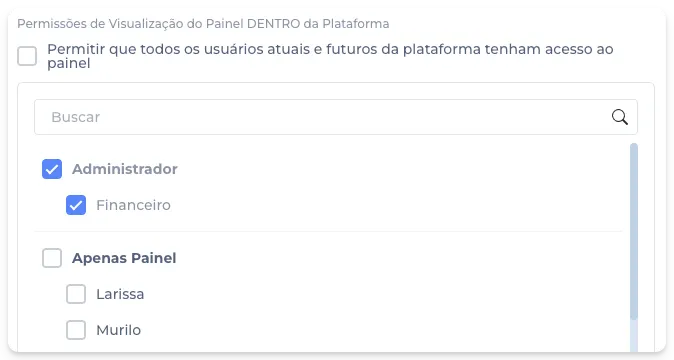 Dentro da seção "Permissões de Visualização do Painel DENTRO da Plataforma”, escolha os usuários que deseja conceder o acesso ao painel em questão.