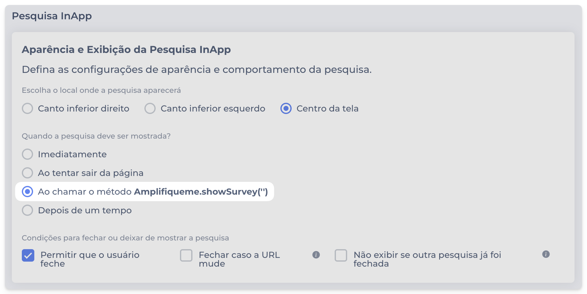 Agora você pode controlar manualmente quando uma pesquisa In-App será exibida. Para isso, basta chamar o método Amplifiqueme.showSurvey() no código do seu site ou aplicação.