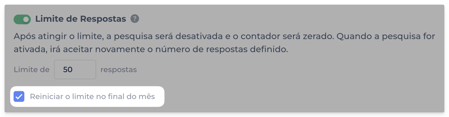 Agora você pode ativar a opção de reiniciar automaticamente o limite de respostas a cada mês. Quando um novo mês começar, o contador será zerado, permitindo que a pesquisa receba novas respostas até atingir o limite definido novamente.