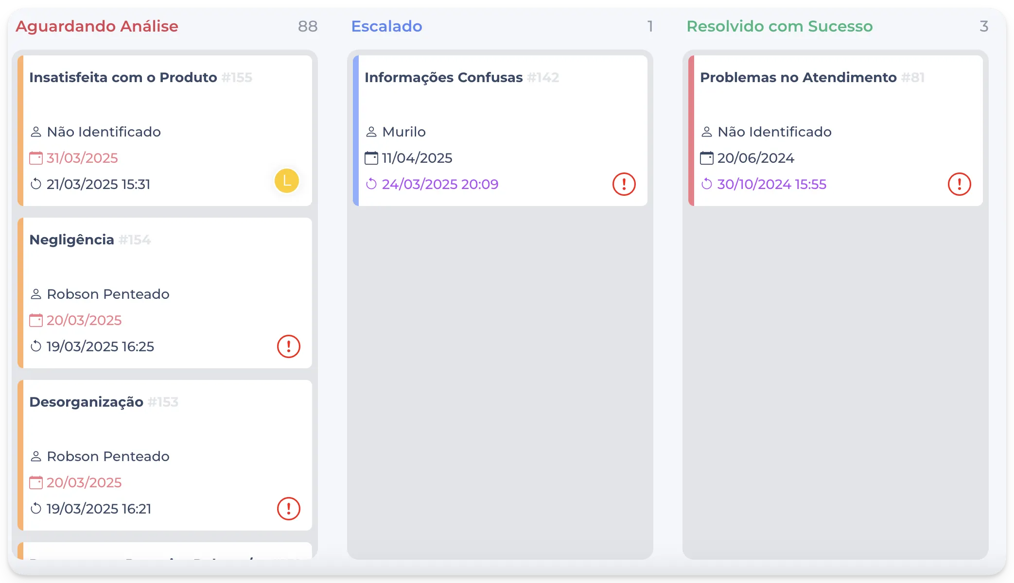 Agora, as cores dos tickets variam conforme a prioridade definida no momento da criação, sendo azul para baixa, laranja para média e vermelho para alta.