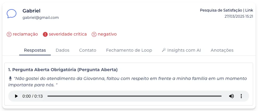 Toda resposta recebida via áudio é automaticamente transcrita utilizando um modelo avançado de inteligência artificial. Dessa forma, todos os recursos do Amplifique.me Insights Insights aplicáveis às respostas em texto também são válidos para respostas em áudio, como classificação de sentimento, severidade, resumo, etc.