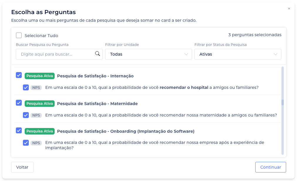 - O criador de cards foi ajustado, facilitando encontrar e combinar perguntas de diferentes pesquisas.