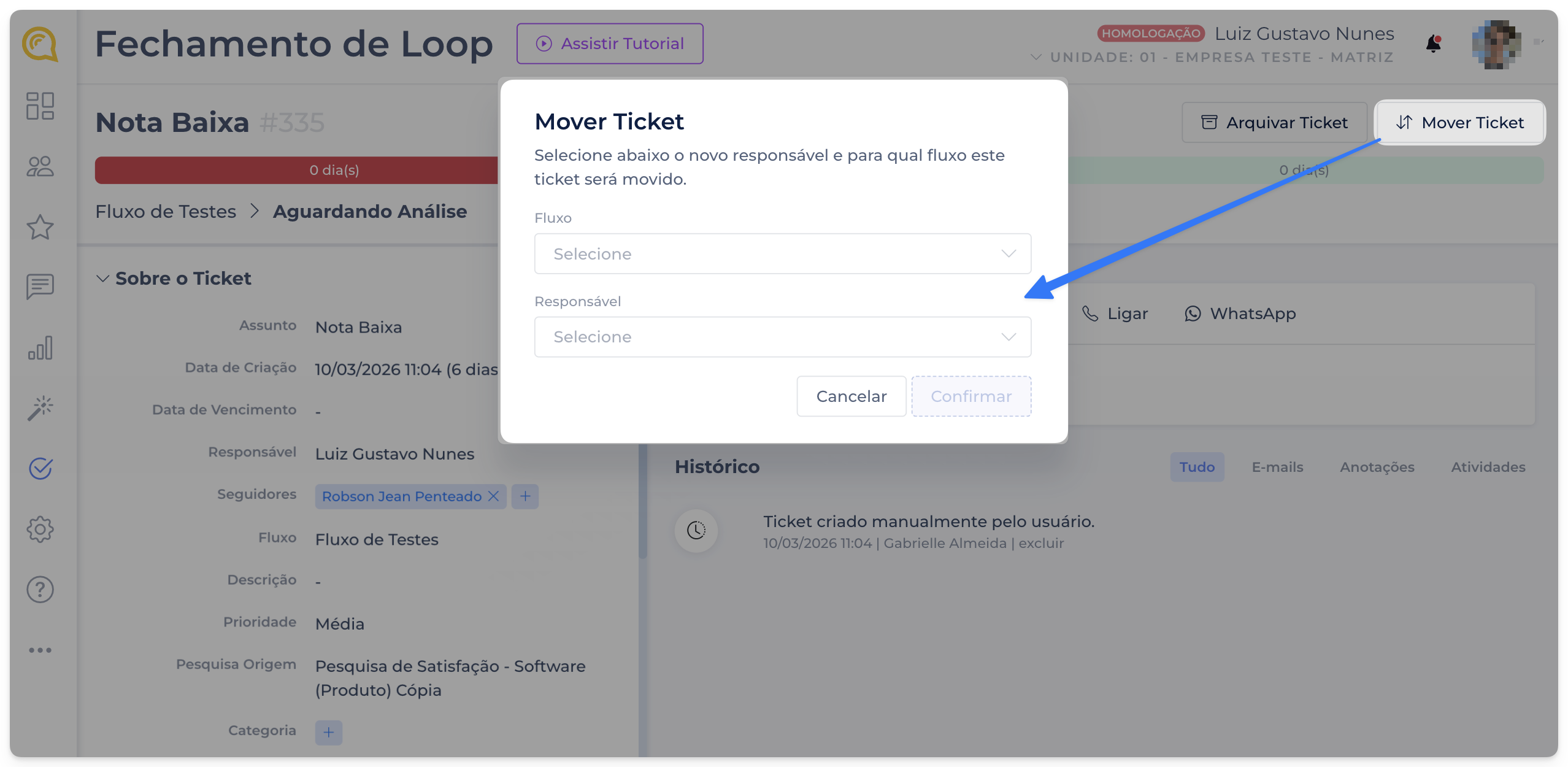 Agora é possível mover um ticket de um fluxo para outro. Basta clicar no botão no canto superior da tela do ticket, escolher o novo fluxo e definir o responsável que irá assumir o atendimento.