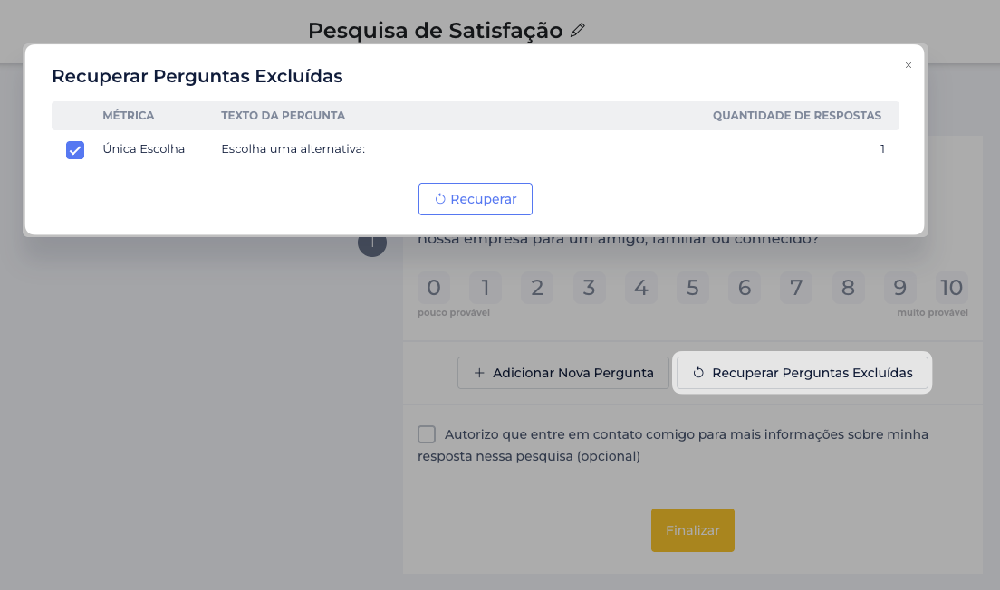 - Agora, perguntas excluídas de uma pesquisa vão para uma lixeira dentro do Criador de Pesquisas, permitindo que sejam restauradas posteriormente junto com suas respostas.
