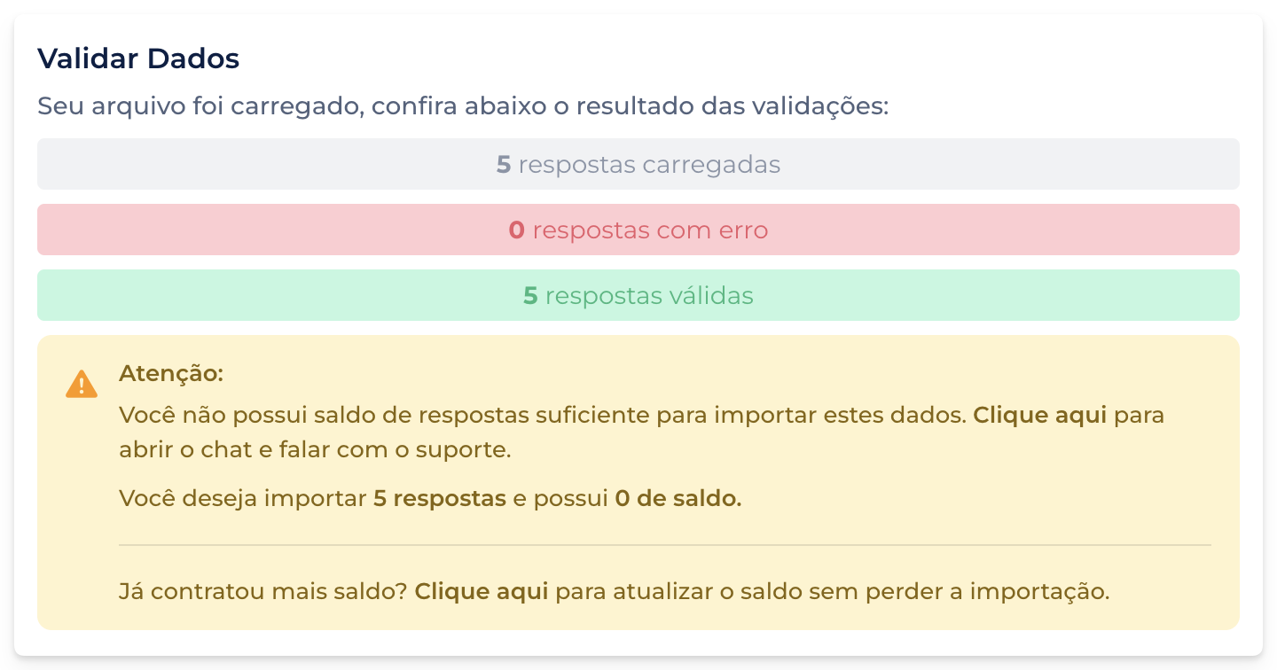 Se isso acontecer, basta realizar uma recarga de saldo para continuar o processo. A importação não será perdida e poderá ser concluída normalmente após a recarga.