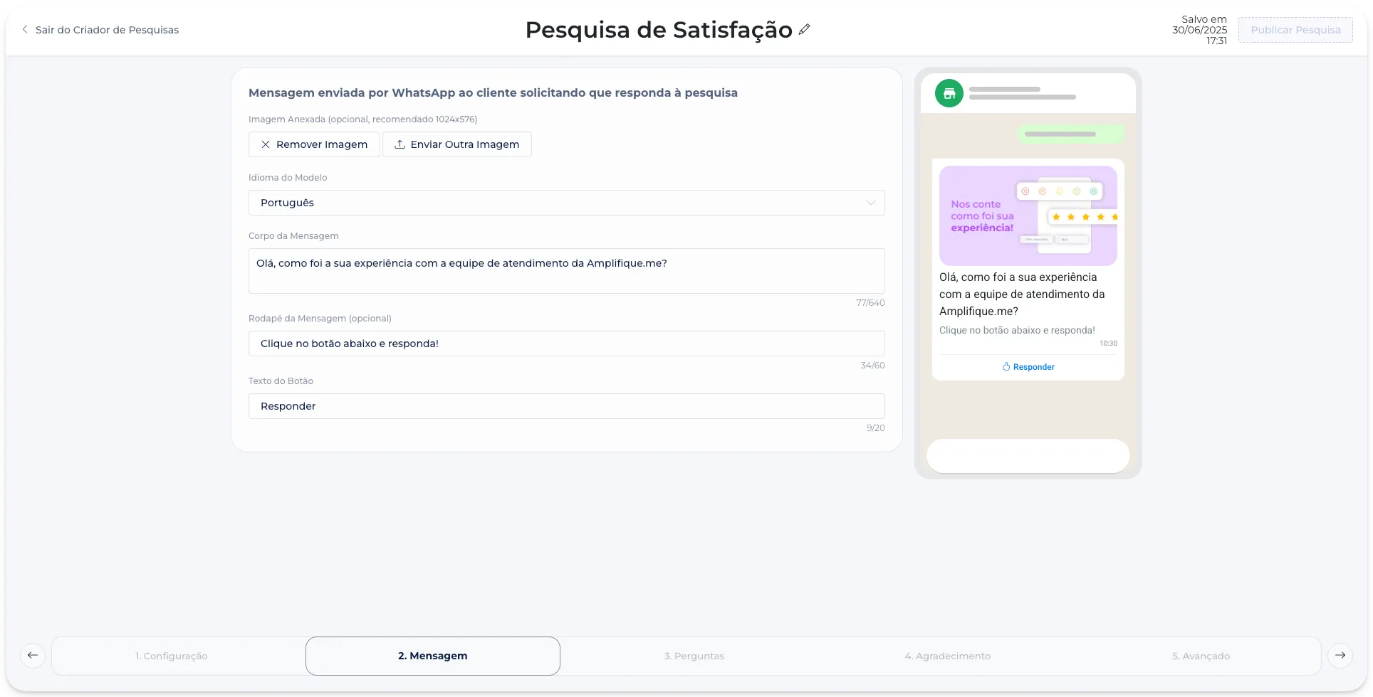 Para tornar essa experiência ainda melhor, desenvolvemos um novo Criador de Pesquisas exclusivo para o Flows — mais intuitivo, com uma pré-visualização fiel à experiência final no WhatsApp.