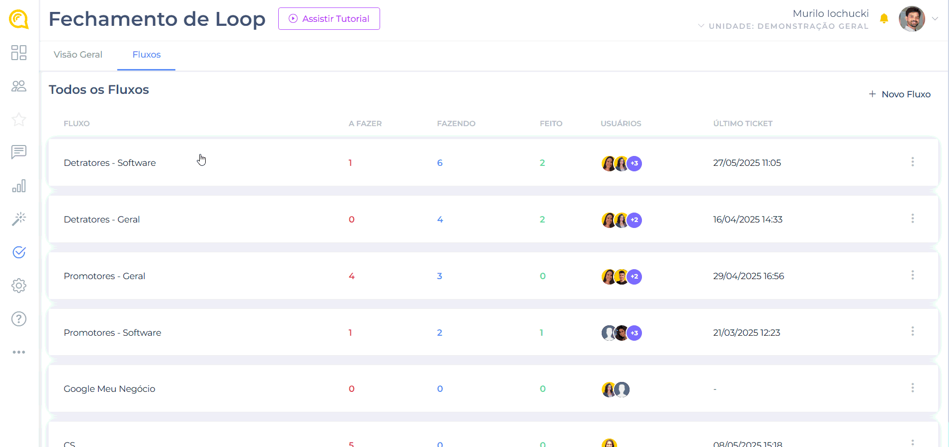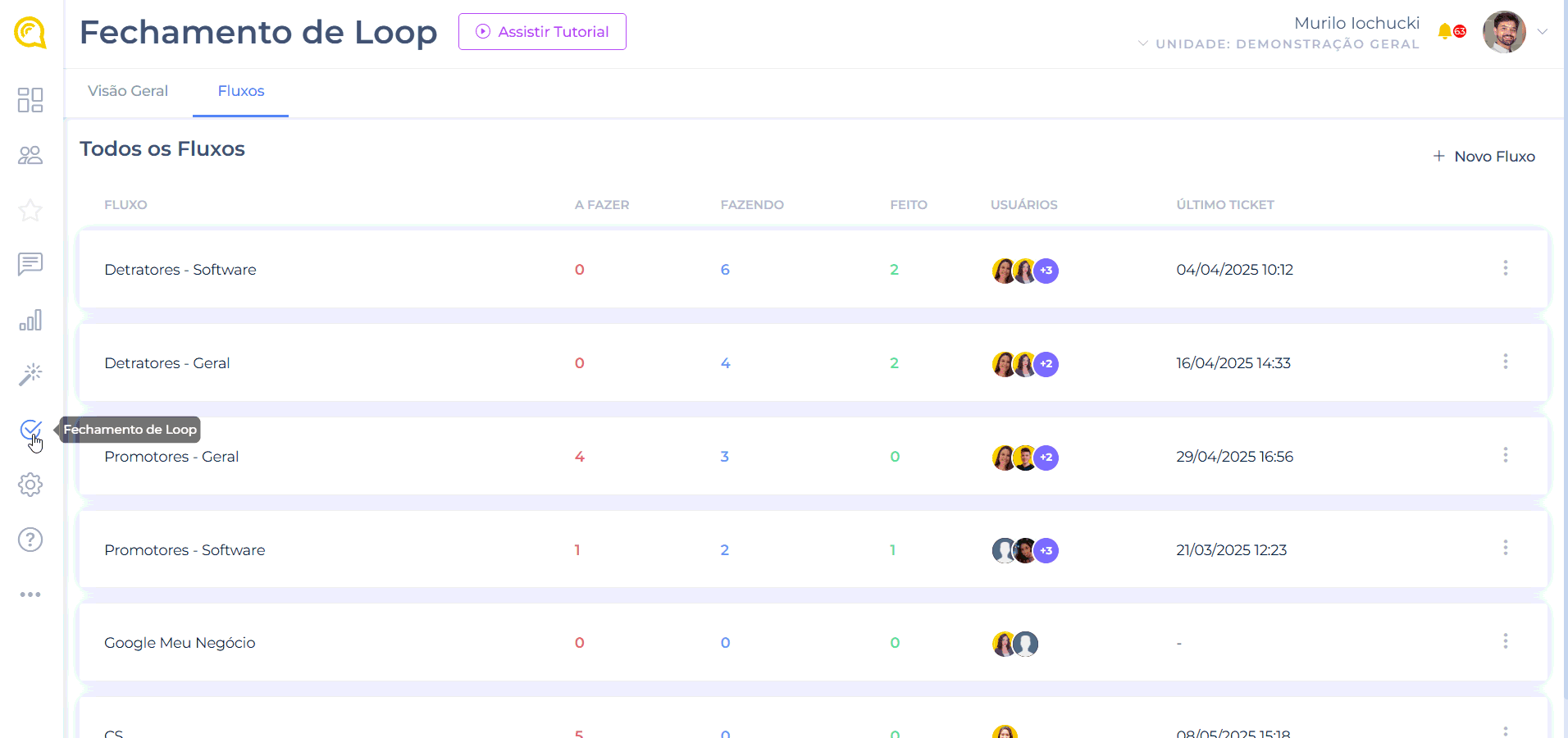 No menu lateral, clique em Fechamento de Loop e selecione o fluxo onde o ticket deve ser criado.