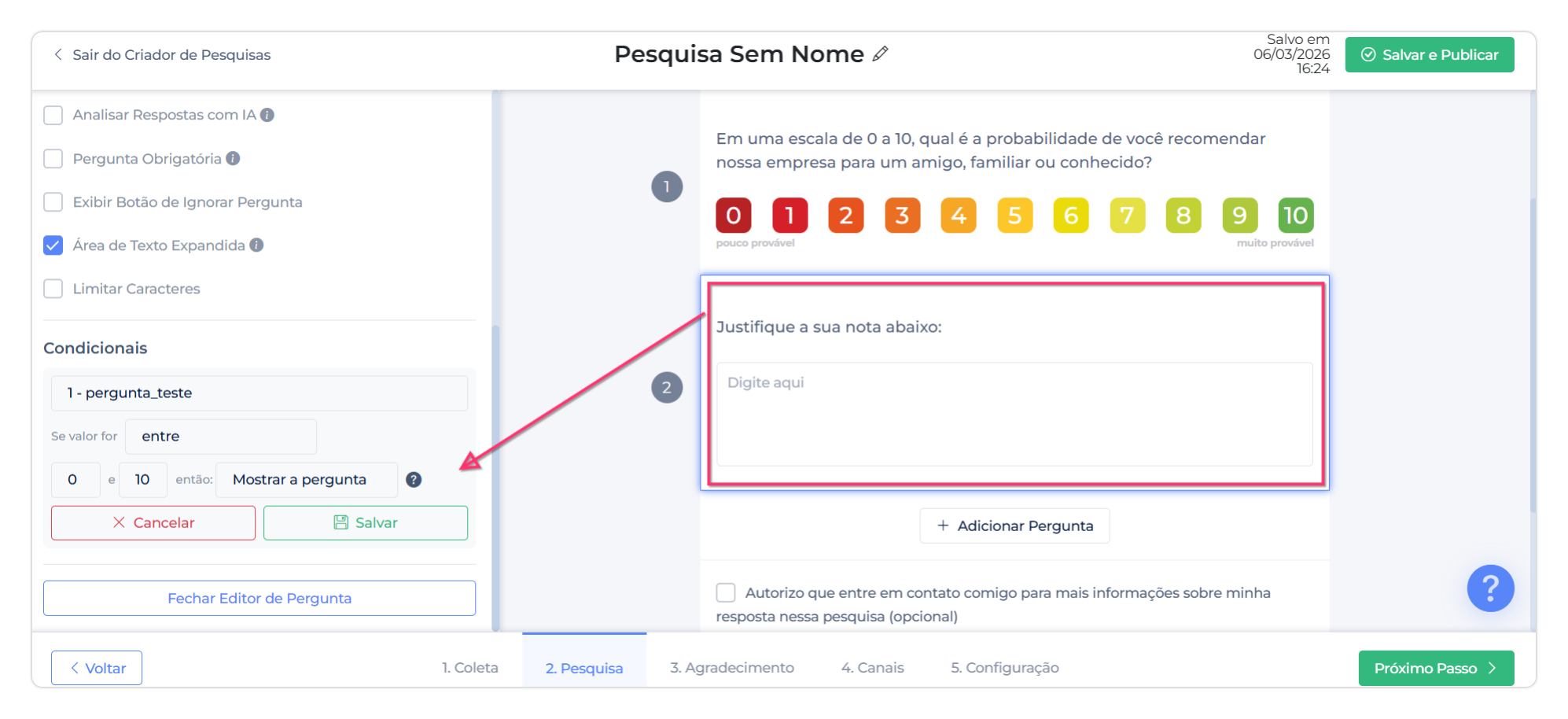 Com todos os canais e condicionais validados, a pesquisa está pronta para ser enviada ao público.