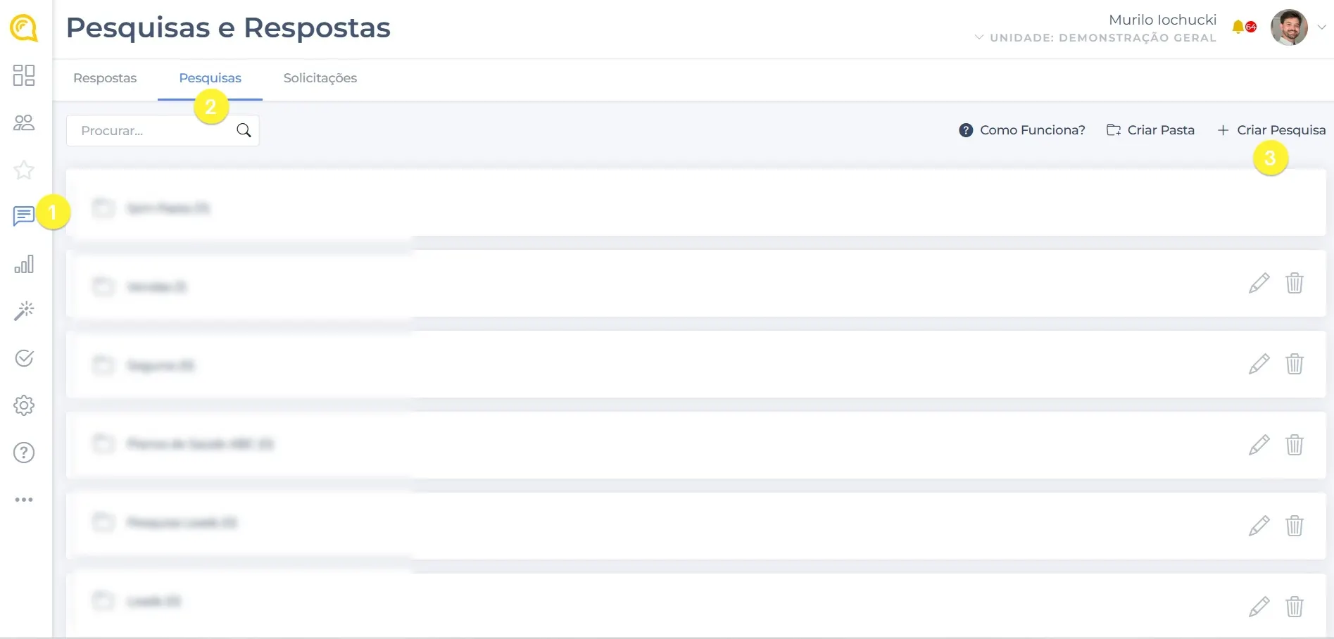 Acesse em Pesquisas e Respostas → aba Pesquisas → Criar pesquisa.