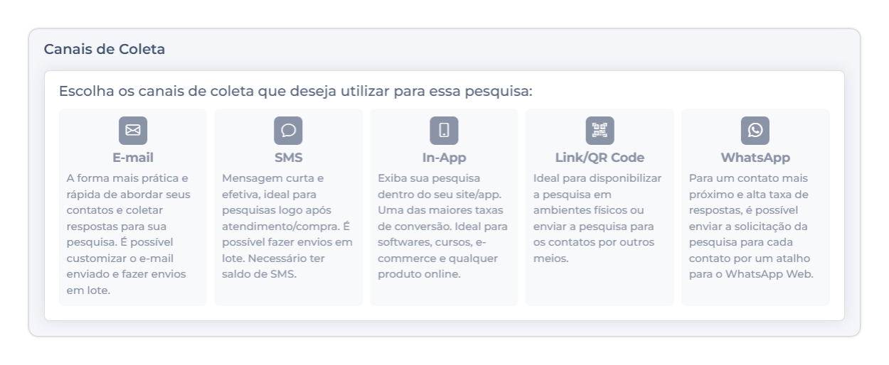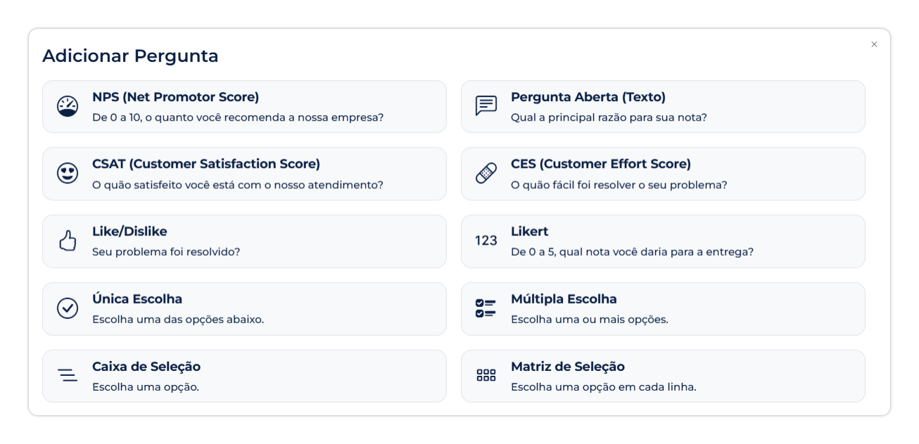Tipos disponíveis: NPS, CSAT, CES, Única Escolha, Múltipla Escolha, Texto Aberto, Like/Dislike, Matriz, Likert, entre outros.