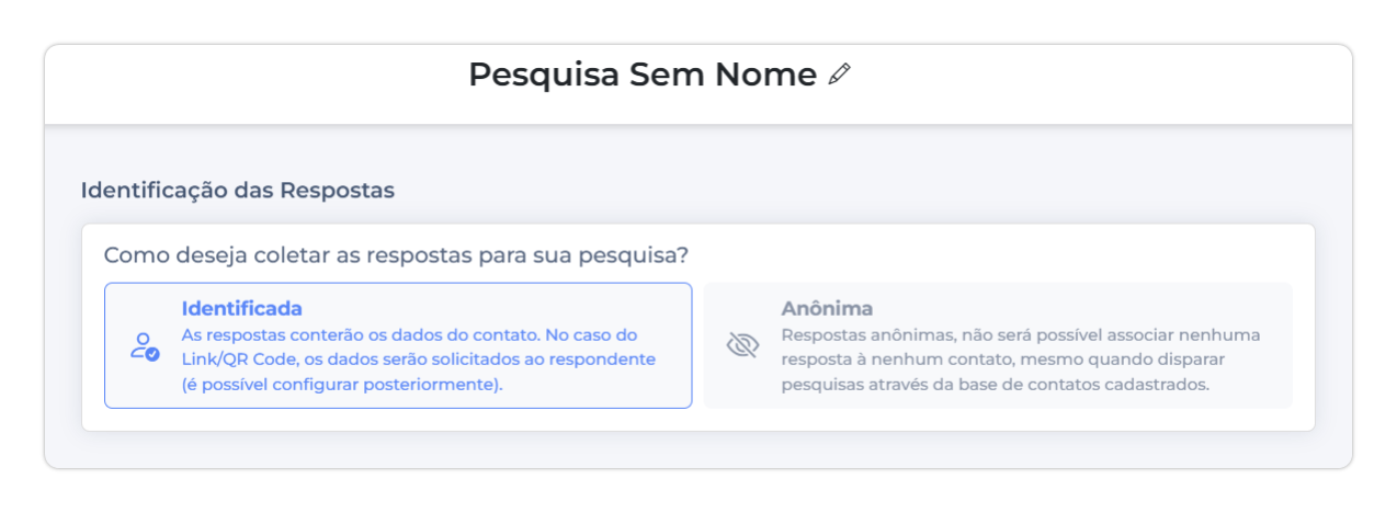 O nome interno não pode ser alterado após a pesquisa ser publicada, pois está vinculado às respostas e relatórios. Escolha com cuidado e use nomes descritivos.