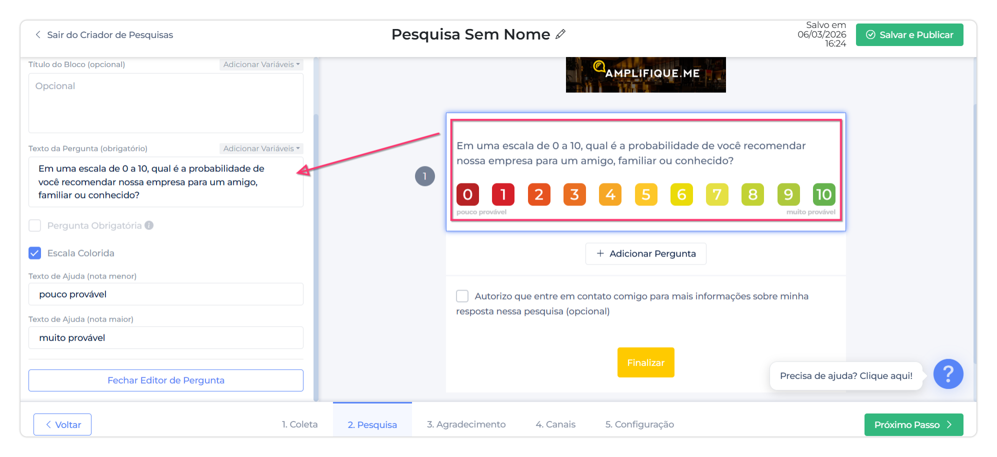 Guia completo para criar pesquisas na Amplifique.me: configurar nome, tipo de identificação, canais, aparência, perguntas, condicionais, agradecimento, automações e realizar o teste antes de publicar.