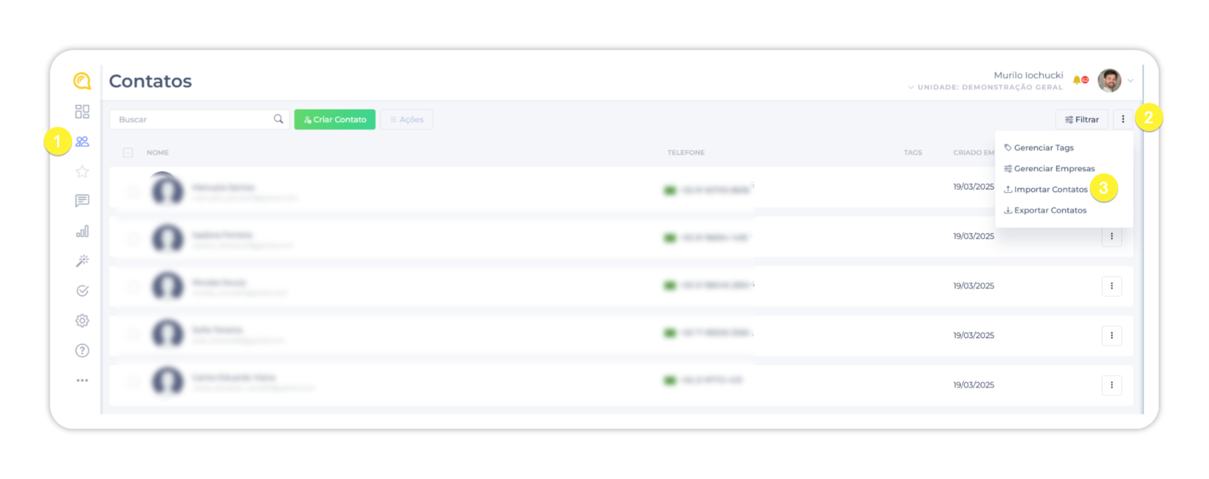 No menu lateral esquerdo, clique em 👤 Contatos. Em seguida, clique no botão Importar no canto superior direito da tela.