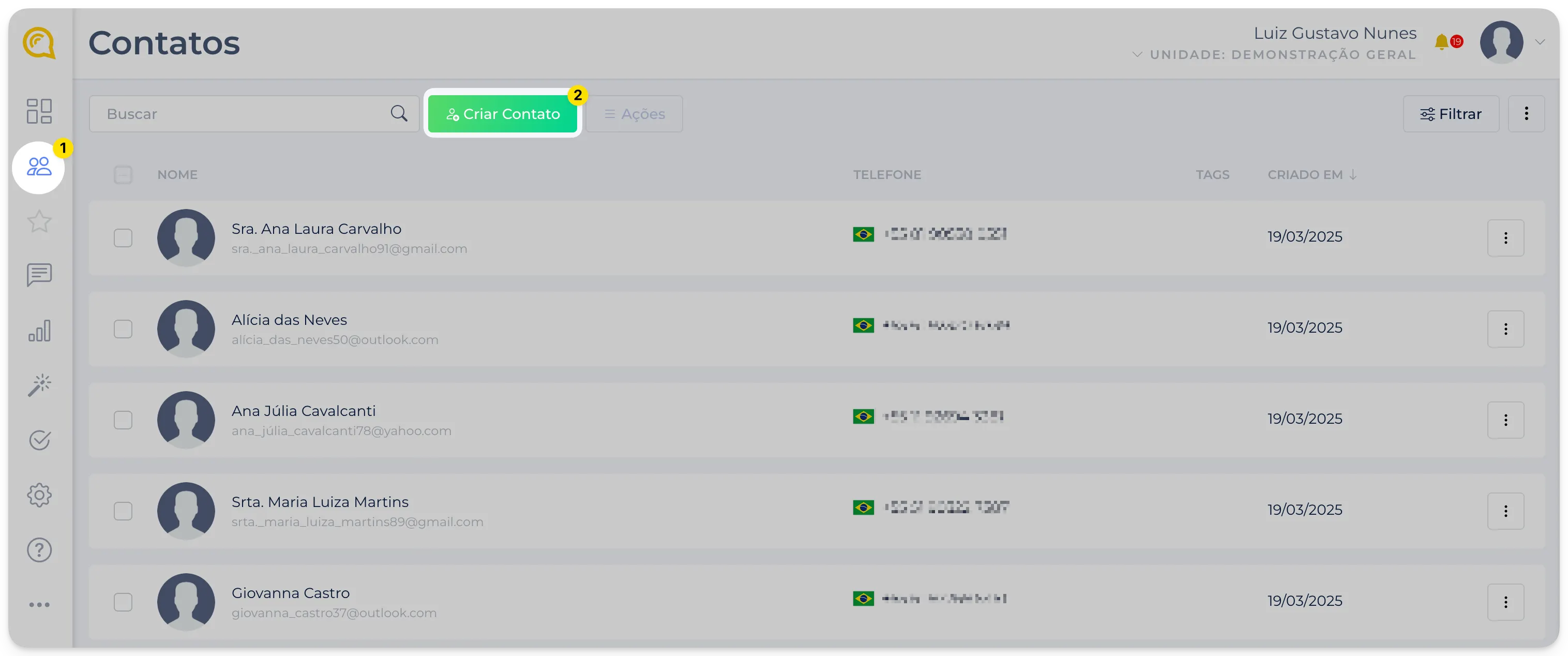 No menu lateral esquerdo, clique em 👤 Contatos.